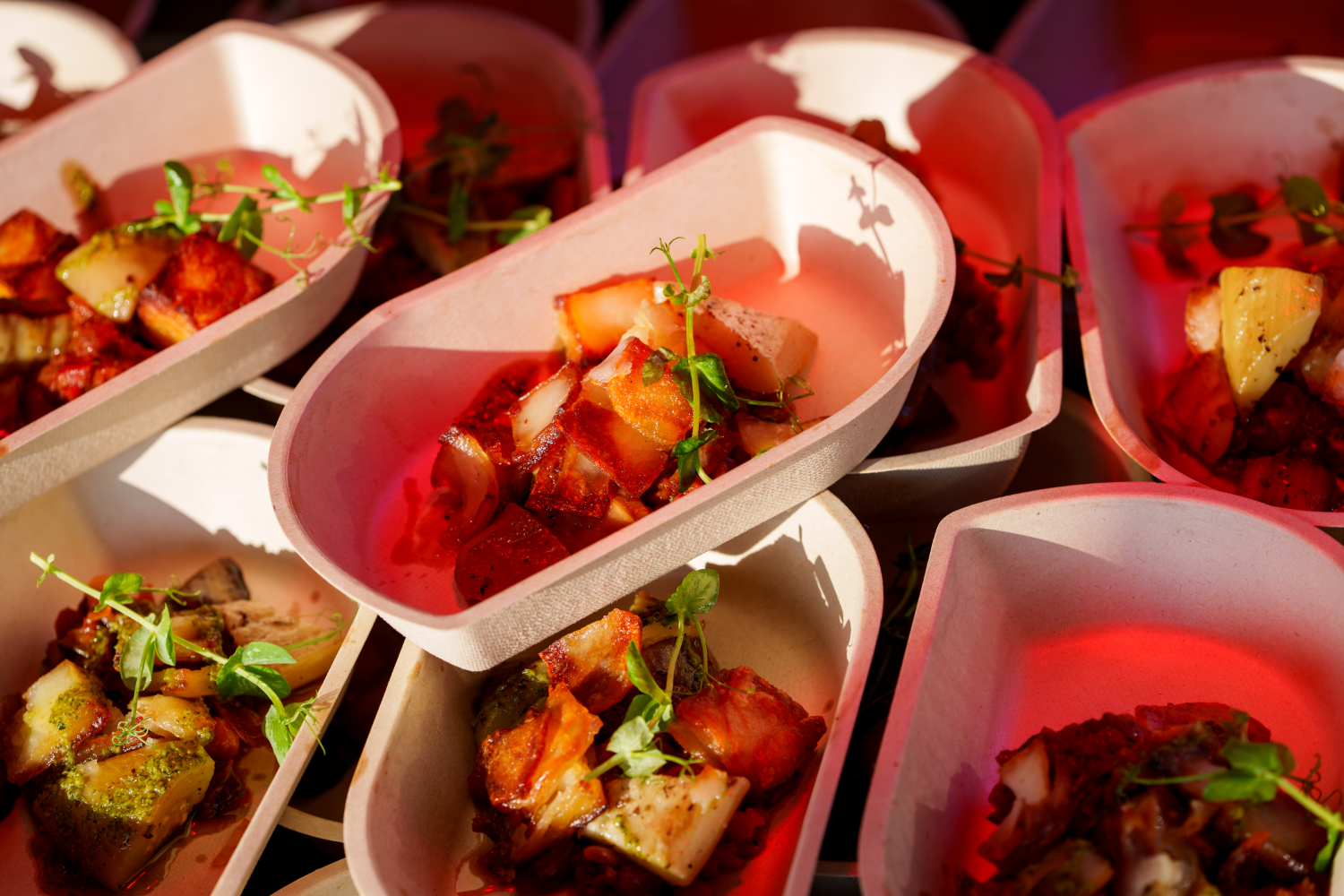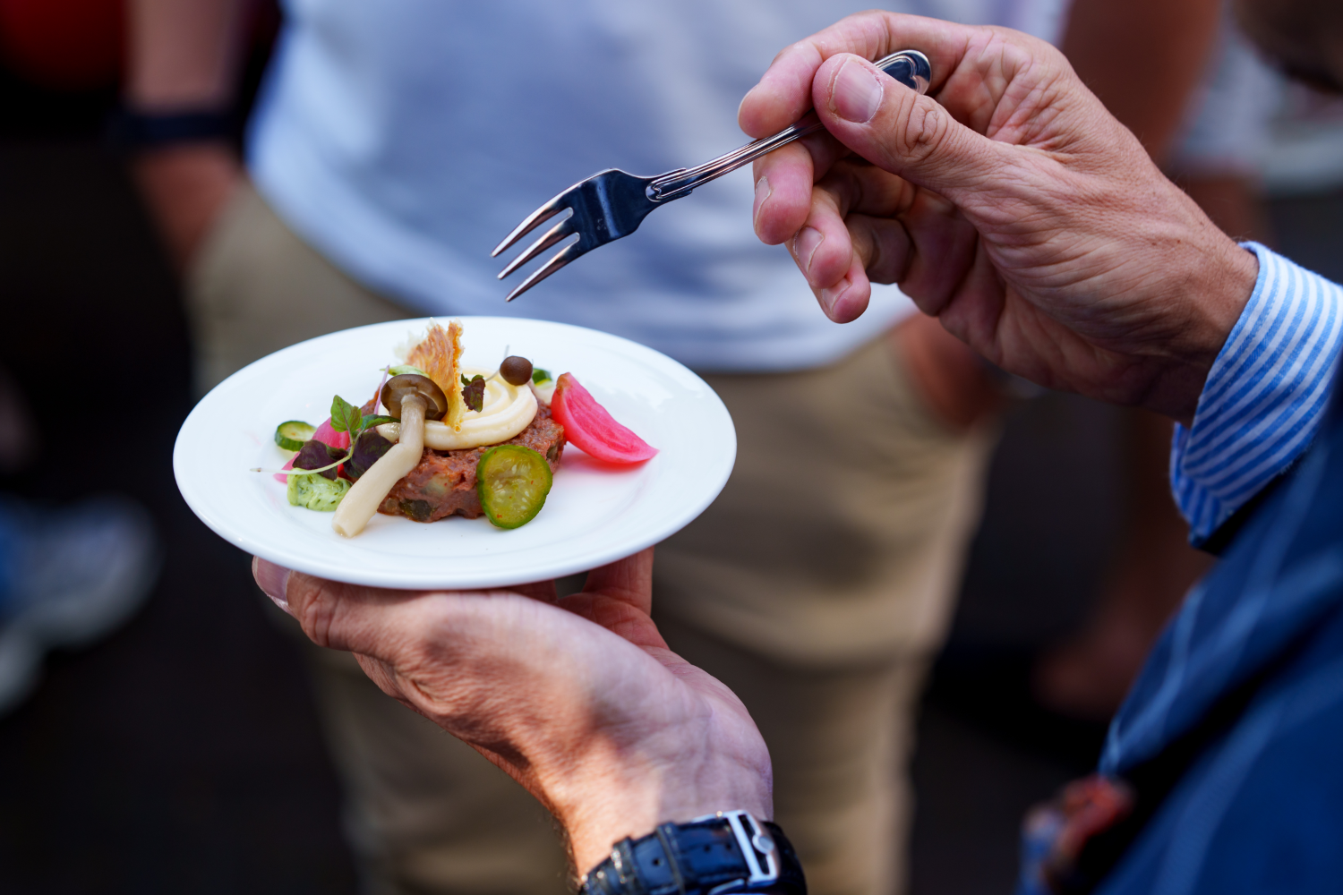 Verspreid over het terrein stonden diverse live cooking stands met gerechten die de sfeer van het event tot leven brachten. Denk aan broodjes pulled turkey van De Sjroete Farm uit Helden, ravioli van Kollenbergerspelt gevuld met scampi’s en een veganistische auberginesteak met mediterrane kruiden en ratatouille. Daarnaast konden gasten genieten van een klassieke Caesar salad en een verfijnde coquille met wakame, truffelparels en schuim van champagne beurre blanc.