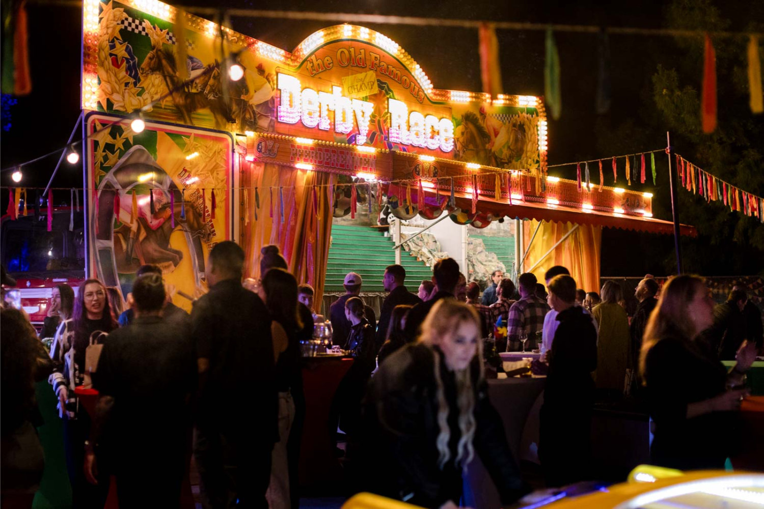 Om de Kermisparade écht tot leven te brengen, zorgden we voor een divers aanbod aan activiteiten. Gasten konden fanatiek de strijd aangaan bij de paardenrace, de leukste herinneringen vastleggen in de photobooth, of de competitie opzoeken met airhockey en tafelvoetbal. De felverlichte LED-letters en de signing volledig in thema maakten de beleving compleet.